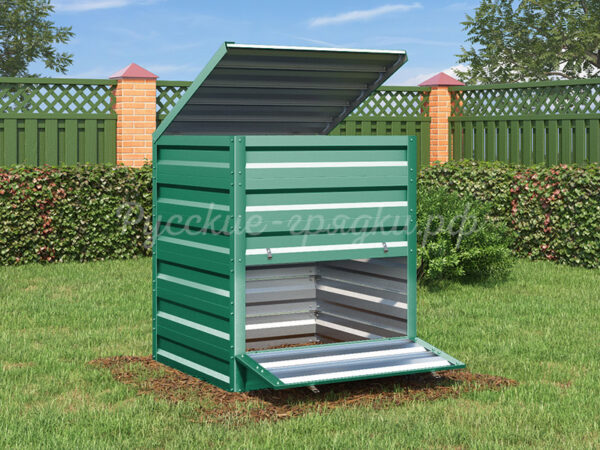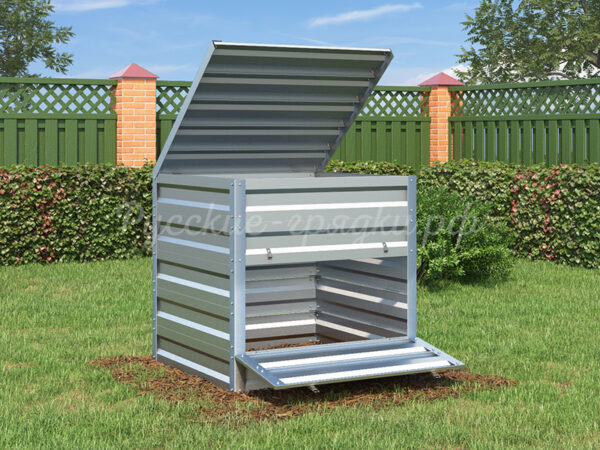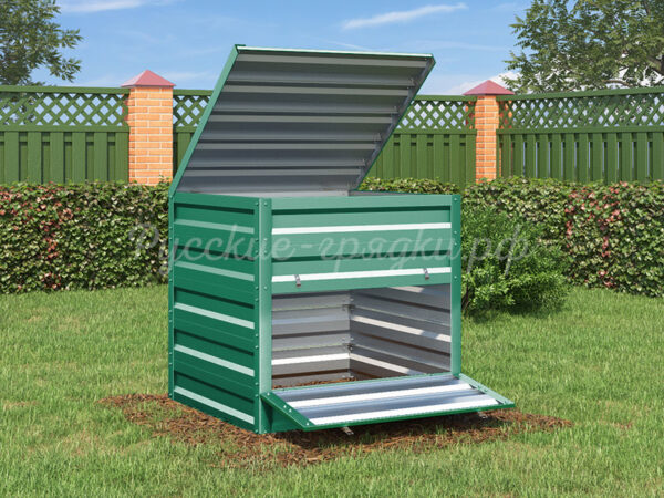 Легкий, компактный и герметичный ящик из оцинкованной стали позволяет с комфортом готовить компост. Конструкция может устанавливаться в любом удобном месте, материал, из которого она изготовлена, не боится влаги, перепадов температур и ультрафиолета. Ящик быстро собирается благодаря геометрической точности элементов, готовым отверстиям и крепежу в комплекте. Для обеспечения стабильного положения он устанавливается на заглубляемые в грунт ножки. Для забора готового компоста в нижней части изделия предусмотрена откидная дверца.
